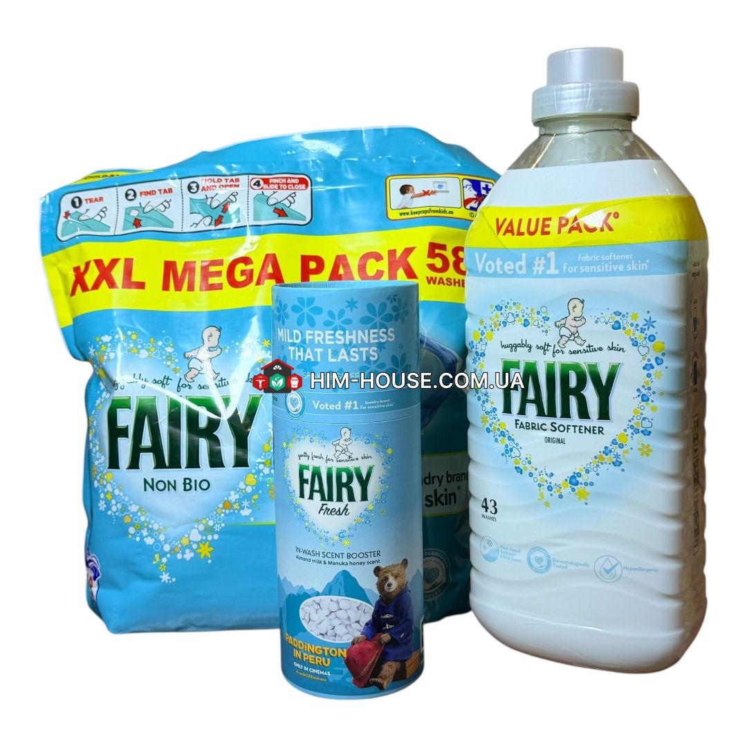 Набір для прання дитячого одягу 1)Капсули для прання дитячої білизни Fairy Non Bio Pods – 58 шт 2)Рідкий ополіскувач/кондиціонер для білизни Fairy Fabric Conditioner/Softener 43 прання 1.413l 3)Парфумований кондиціонер для білизни в гранулах Fairy fresh 176g