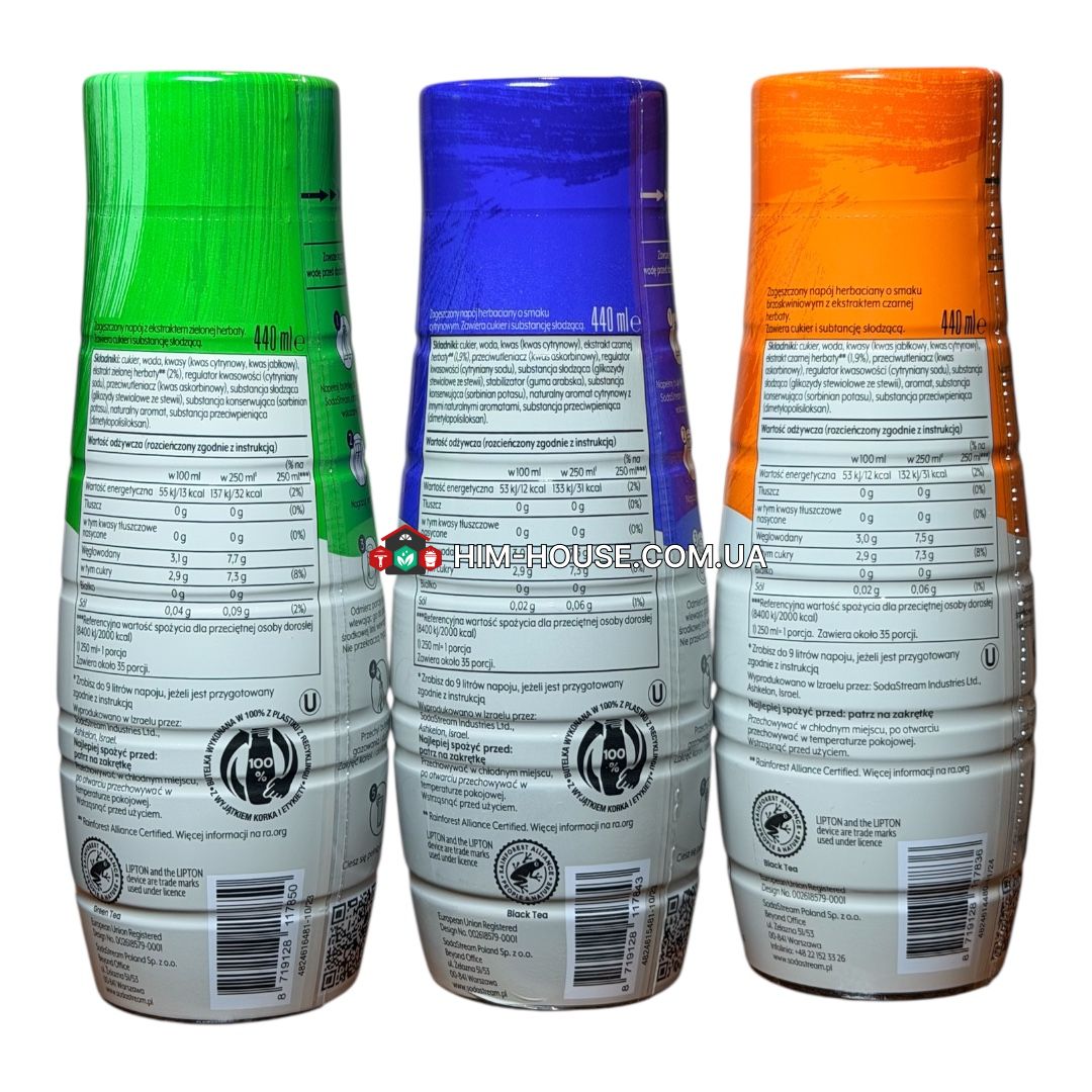 Набір сиропів SodaStream LIPTON дозволяє приготувати улюблений холодний чай у домашніх умовах — з легкою газованістю або без неї. Кожна пляшка 440 мл розрахована в середньому до 9 літрів готового напою (залежно від насиченості смаку).