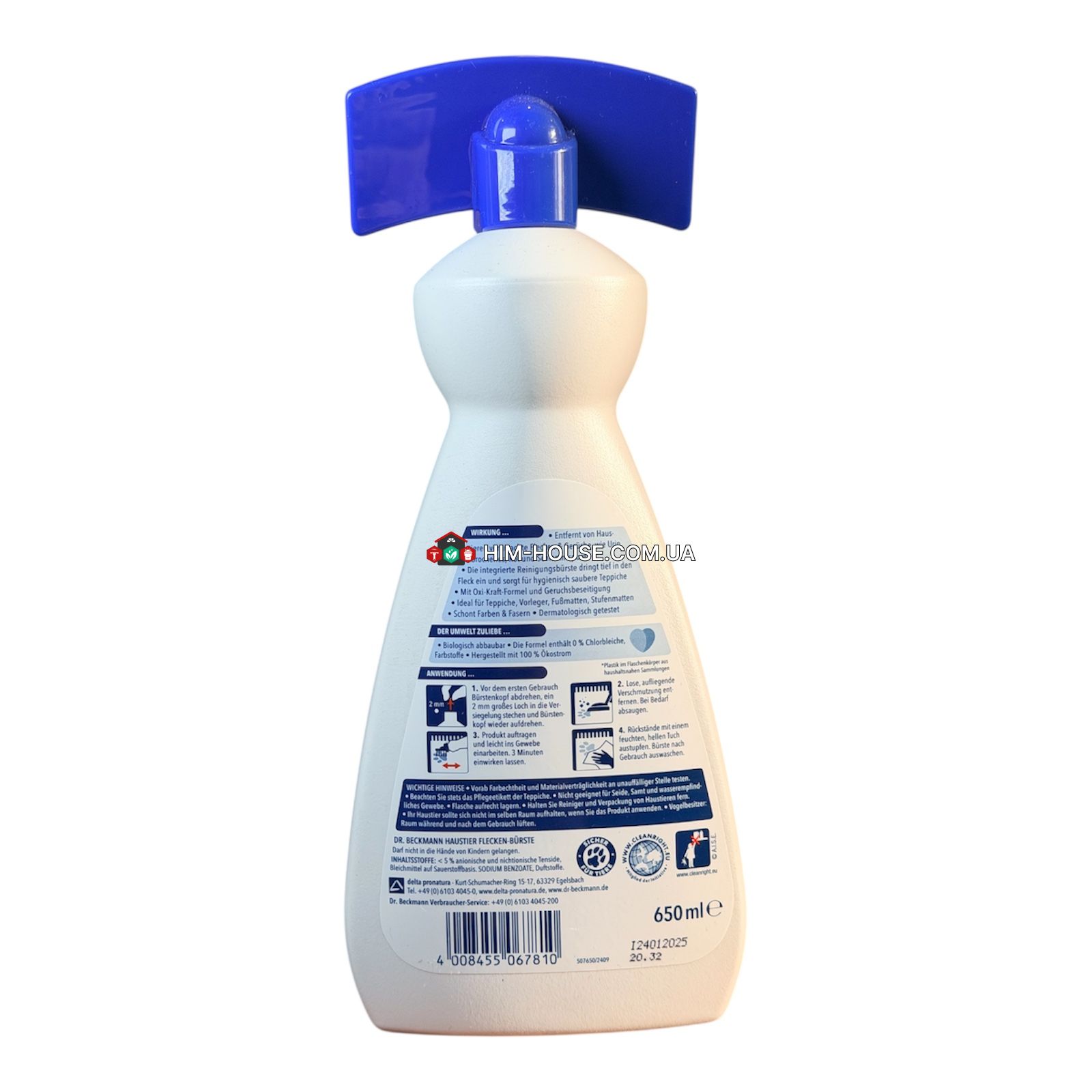 Dr. Beckmann Pet Stain & Odour Remover 650 мл — спеціальний засіб для видалення плям і неприємних запахів, особливо від домашніх тварин, на текстильних поверхнях, килимах і меблях.