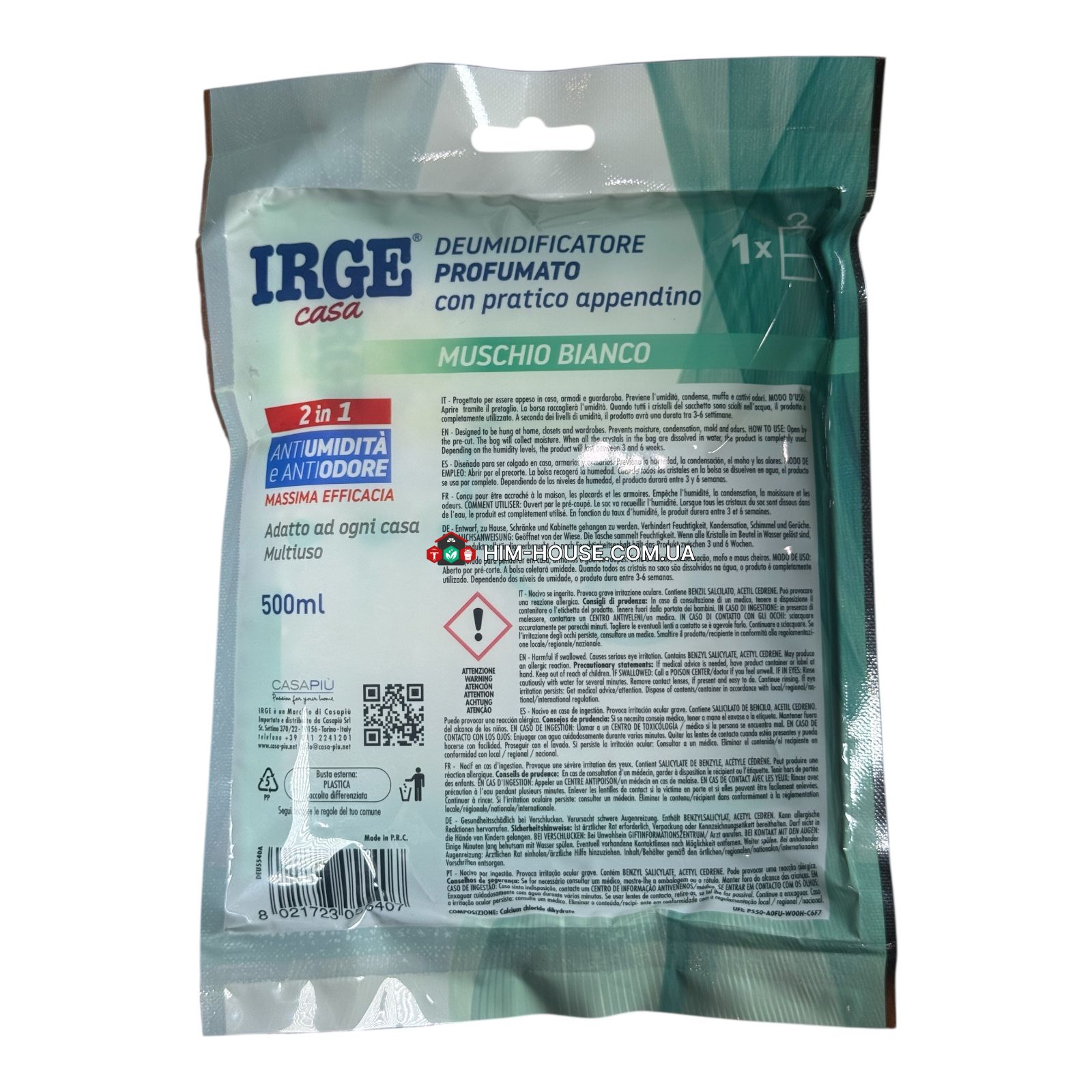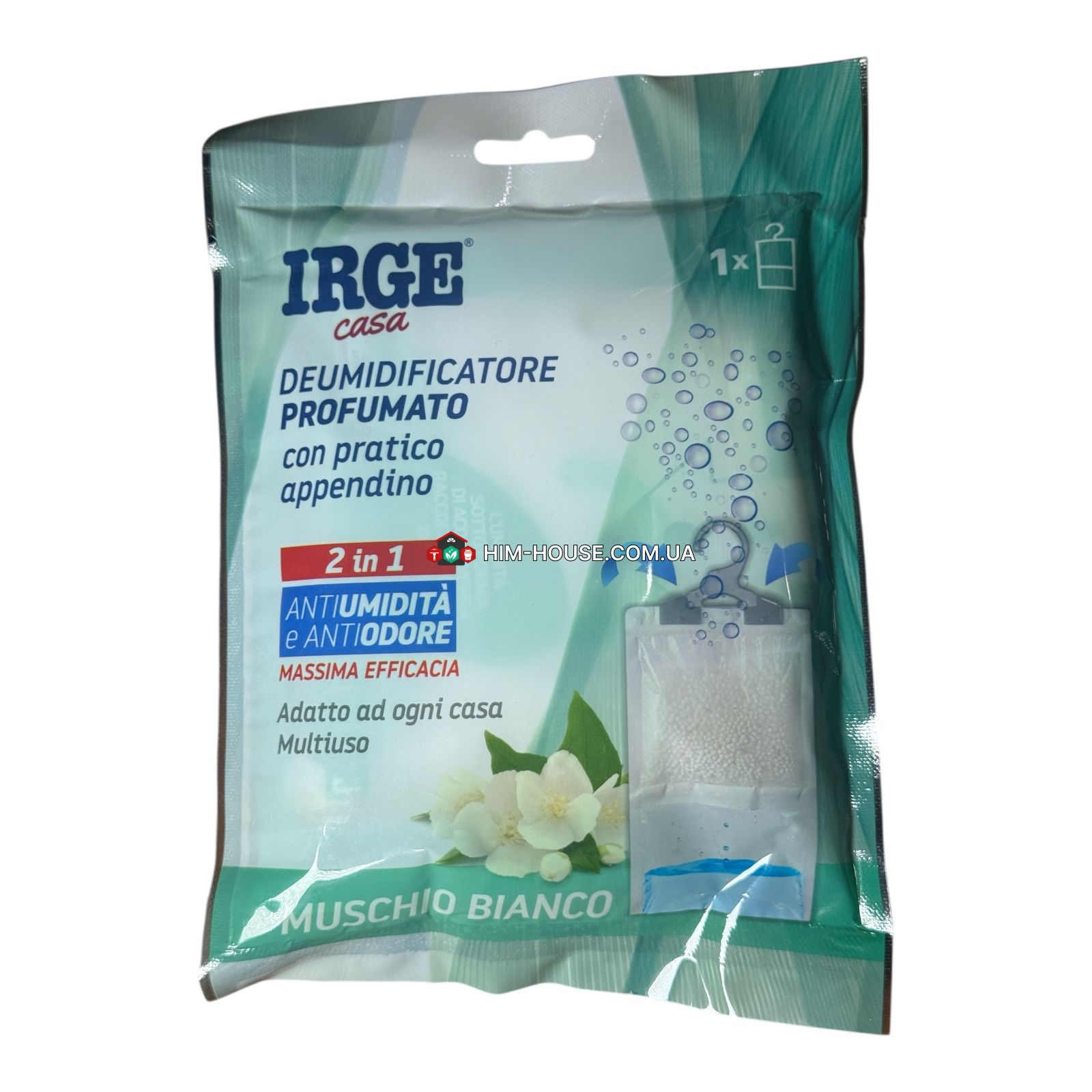 Irge поглинач вологи та запаху з ароматом білого моху (Muschio Bianco) ефективно бореться з підвищеною вологістю у приміщеннях, усуває неприємні запахи та наповнює простір ніжним, свіжим ароматом. Ідеально підходить для використання у шафах, гардеробах, ванних кімнатах, підвалах, авто тощо. Компактний формат із підвісом дозволяє зручно розміщувати засіб вертикально.