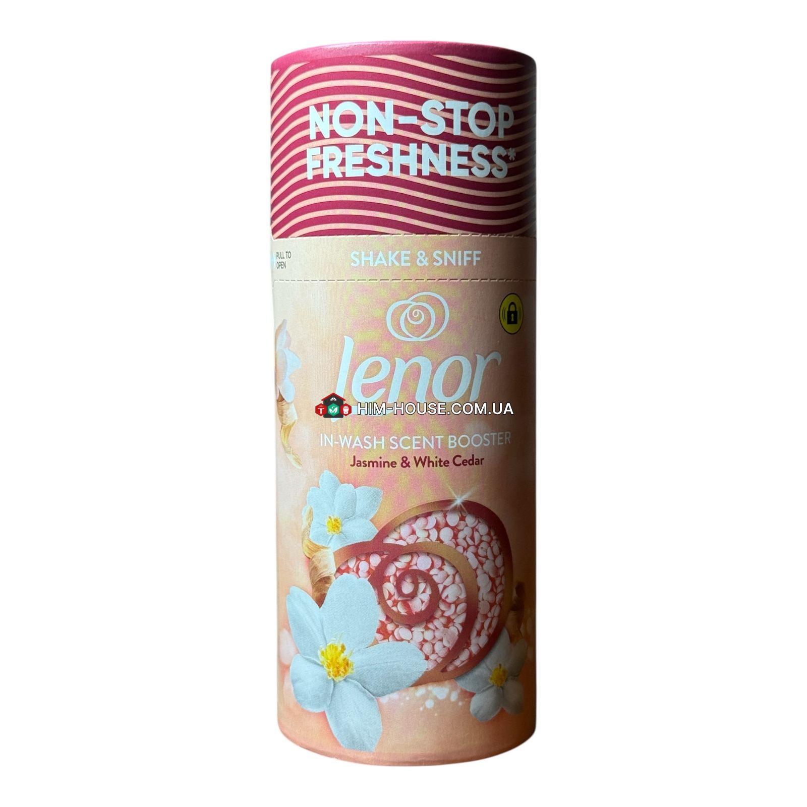 Lenor Jasmine & White Cedar — ароматичні гранули, які додаються безпосередньо в пральну машинку разом із пранням. Їх задача — надати білизні тривалий, виразний, квітково-деревний аромат жасмину і білого кедра, який зберігається навіть під час зберігання речей у шафі до 12 тижнів.