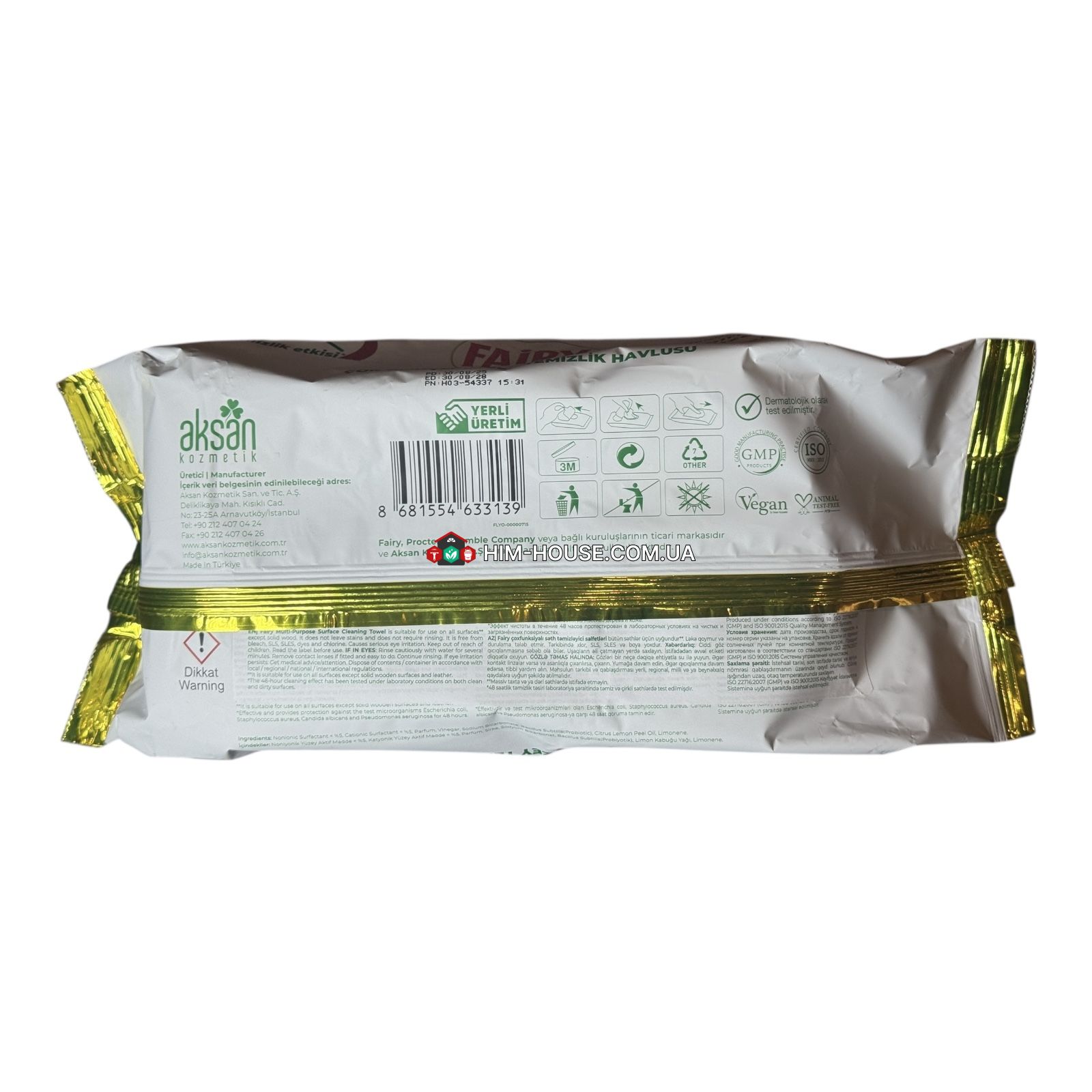 Склад вологих серветок Fairy включає комбінацію очищувальних і доглядових компонентів, які ефективно справляються із забрудненнями, але при цьому є безпечними для більшості поверхонь: